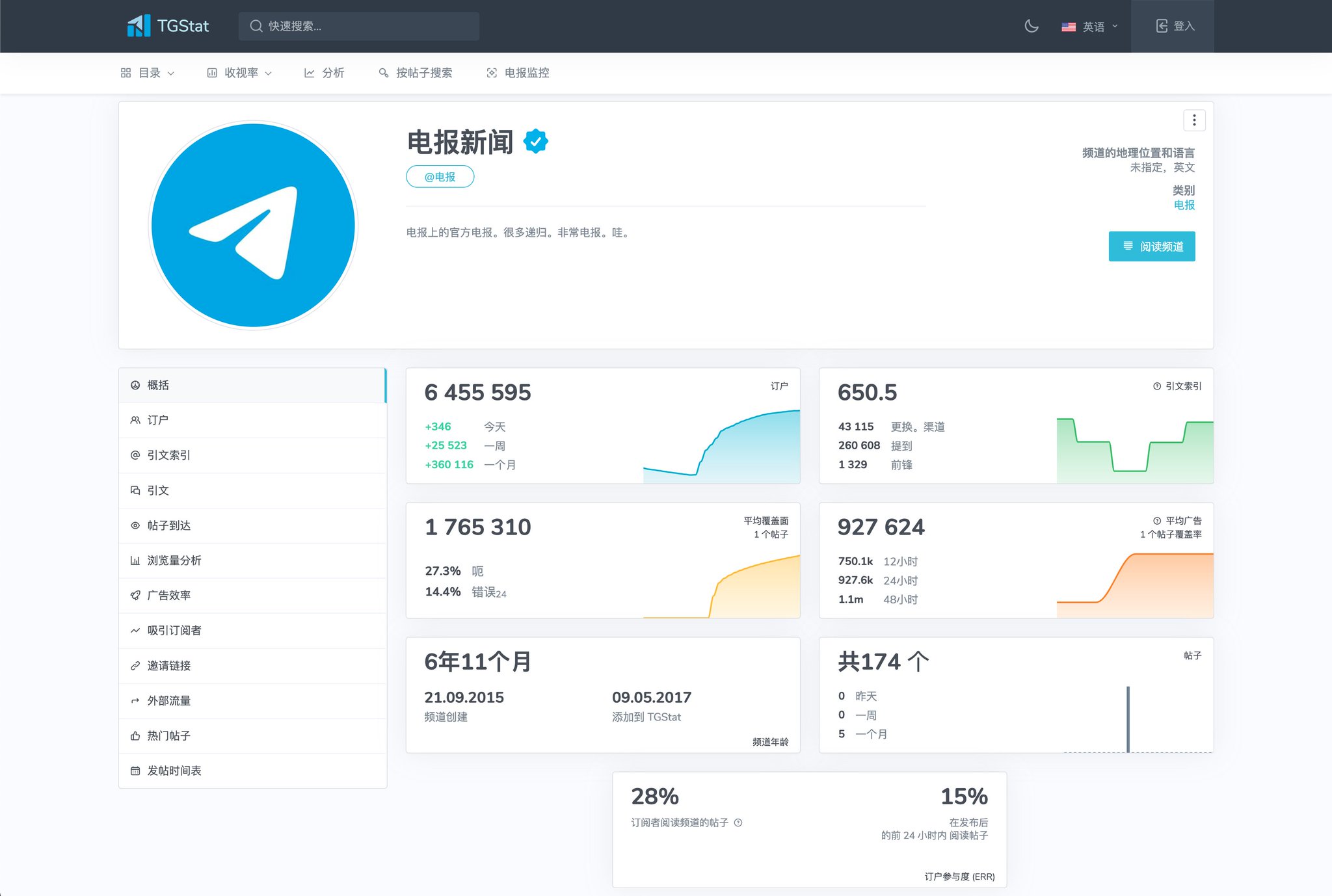 ahhhhfs on Twitter: Telegram频道群组数据查看工具-TGStat 包括订阅人数、人数增长、发布数等等 还提供搜索和