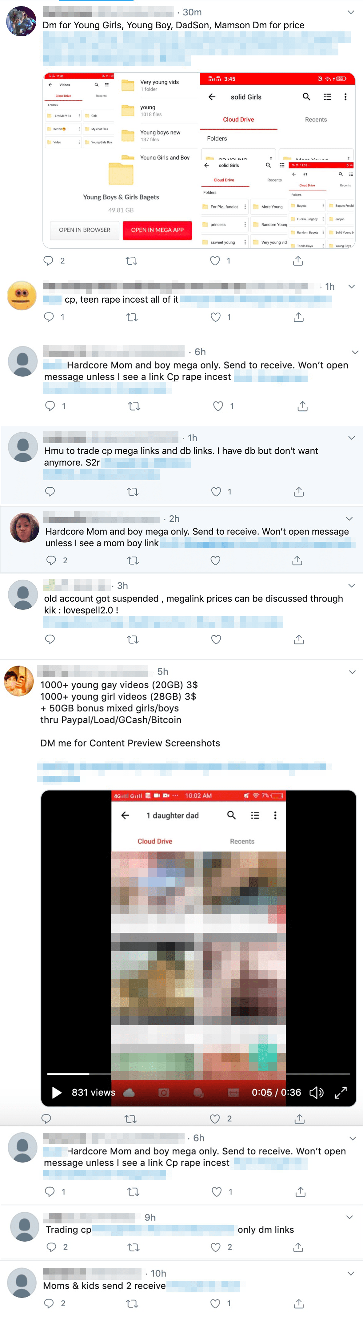 Child pornography being publicly traded on Twitter. Twitter does